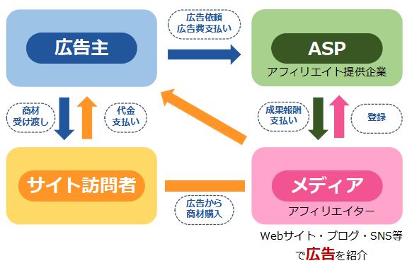 アフィリエイトの仕組みは、広告を出稿する「広告主」と、その広告を掲載する「メディア(アフィリエイター)」、広告主とメディアをつなぐ「ASP」、メディアに訪れる「サイト訪問者(ユーザー・消費者)」にそれぞれメリットのある仕組みです。